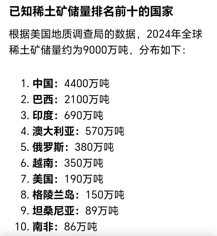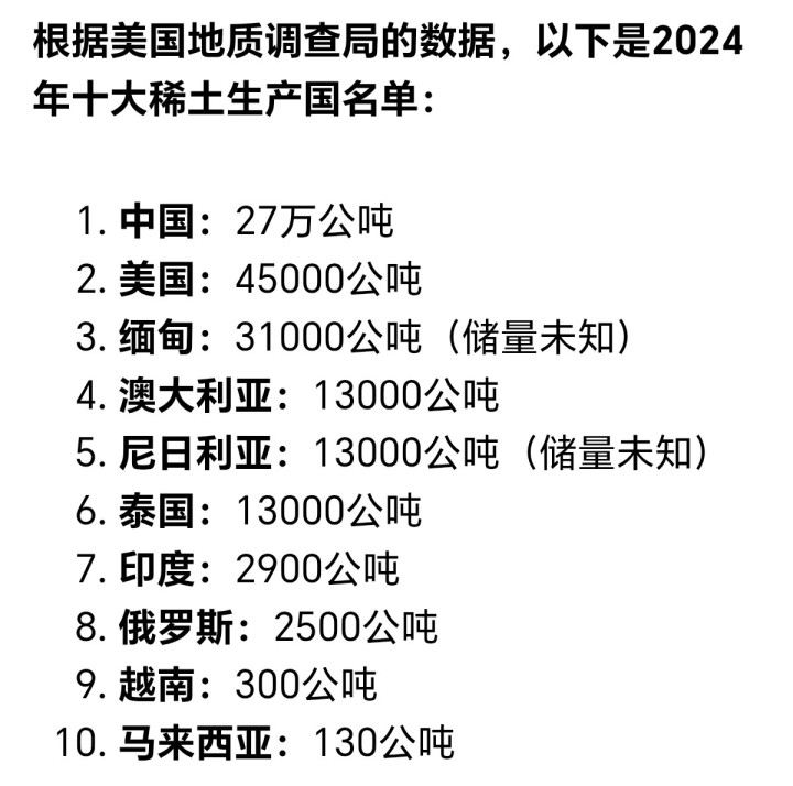 中好意思稀土之争,如果你认为好意思国事因为稀土储量少,才落于下风,那就大错特错了。还有一个反常的事实是,前年全宇宙稀土十大出产国,好意思国的稀土,出产量排行宇宙第二。
