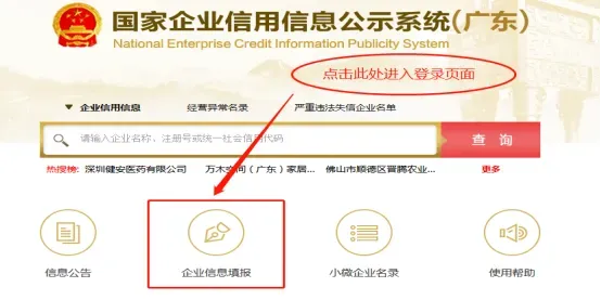 1.请使用IE8及以上版块登录国度企业信用信息公示系统(广东),点击“企业信息填报”。