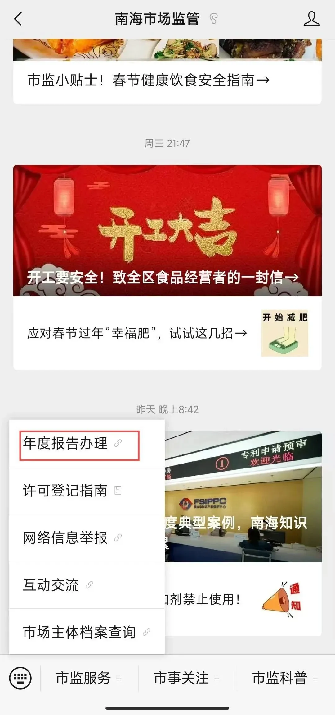 1、存眷官方公众号“南海商场监管”,回答要津词【年报】或点击菜单栏【市监工作】—【年度讲述办理】,点击连络跳转到“国度企业信用信息公示系统”页面。