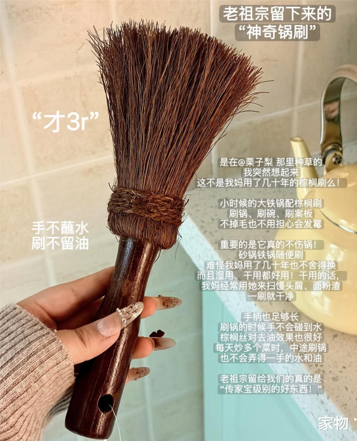 小技能就用过的旧式锅刷,刷头应该是棕榈毛的材质,厨房里一切沾染了油污的餐具厨具,齐可以用它刷洗,尤其是我家那口大铁锅,既能刷掉油污锈渍,又不会伤及锅体,居然有些东西,真实是旧式的更好用啊。