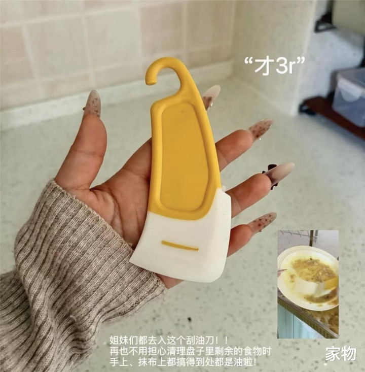 就是用来刮掉吃完饭后,碗碟餐具里凝固的油污简略剩下的厨余剩饭的,每次洗盘子之前用它刮一遍,不仅清洗起来更浮浅,还能幸免洗碗布上沾染太多油污,变相栽培其使用寿命。