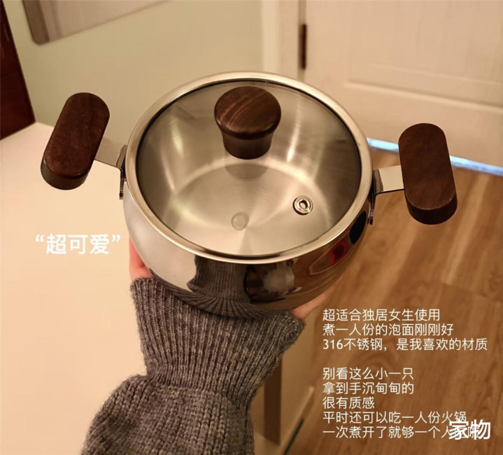 一个超小号的双耳锅,看起来就圆滔滔的很可儿,材质是316不锈钢,耐用又安全,因为锅壁较厚,小小一个如故挺有重量的,平时用它煮个泡面、一东谈主食的寿喜锅,齐至极可以,个东谈主如故比拟推选的。