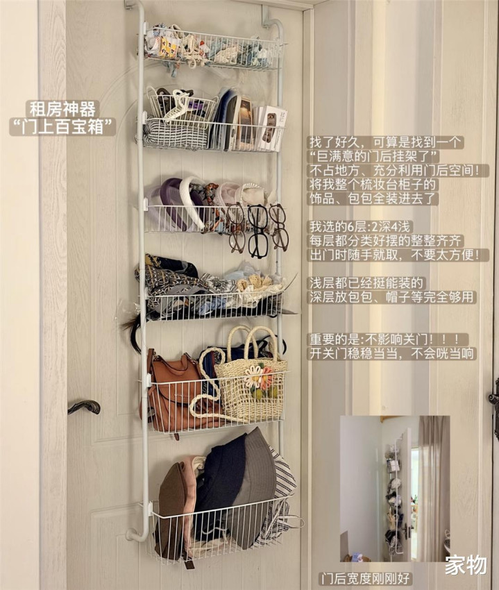 家里空间小的话,当然要将能诈欺的每一寸空间尽量诈欺起来,就拿门其后例如,其实装配一组多层挂架,行为念收纳篮收纳发夹、帽子、包包等小件衣物或用品齐至极合适,能充分诈欺纵向空间,缓慢家中收纳职守。