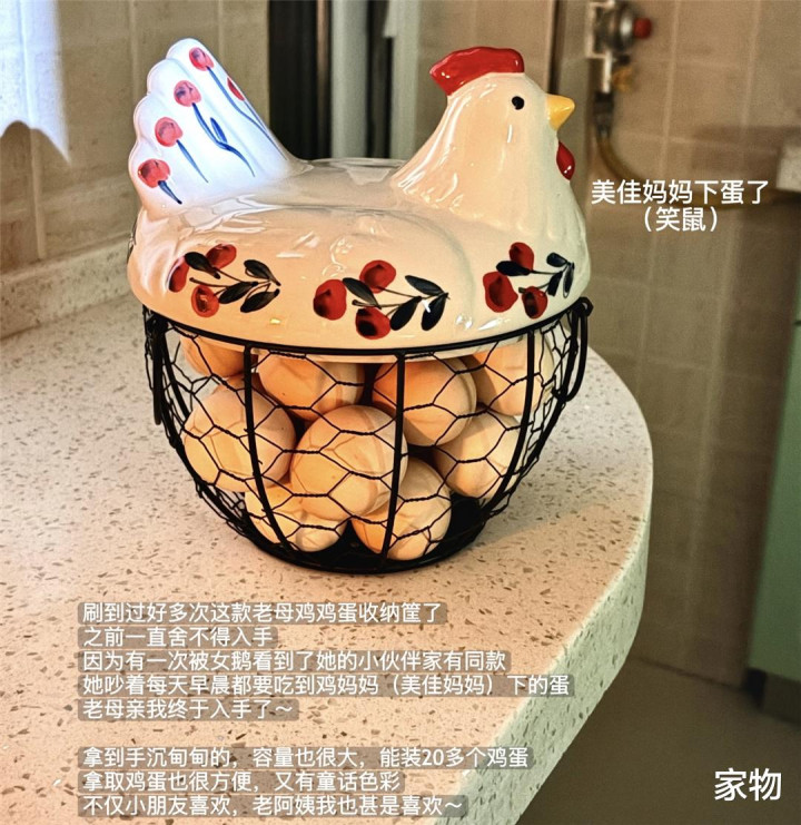 平常看到有东谈主推选的鸡蛋筐,底部是铁艺编织而成,盖子则作念成了一个彩绘陶瓷的老母鸡造型,看上去颇具好意思式田野立场,放在厨房里就像是个用心准备的遮拦品,又可儿又意旨,真实让东谈主忍俊不禁。