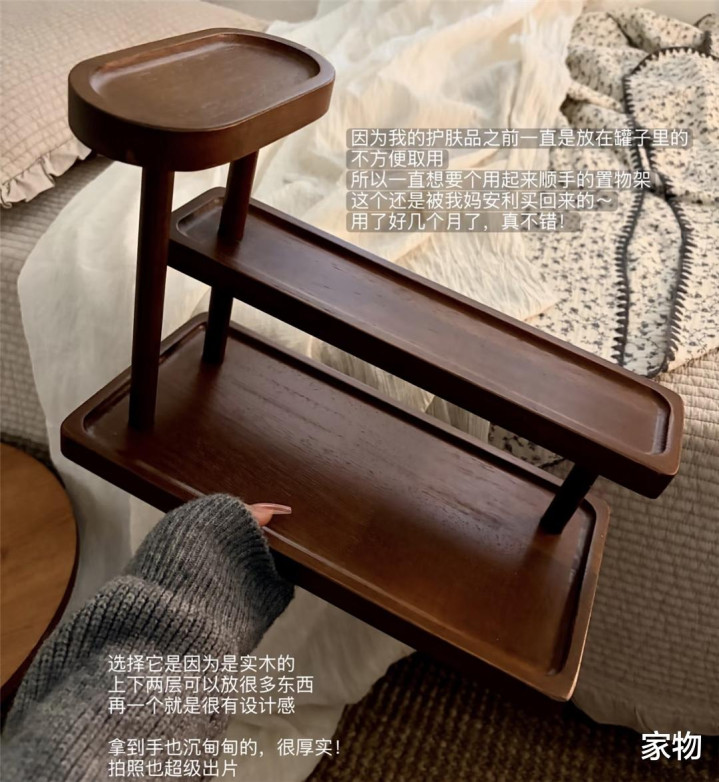 看上去是三层,推行上是一大一小两层加上一个顶拖的架子,我发现它最恰当的场景有两处,一是放在玄关,收纳钥匙钱包等多样随身用品,二是放在梳妆台上,收纳护肤品和小件首饰,又能诈欺纵向空间又面子。