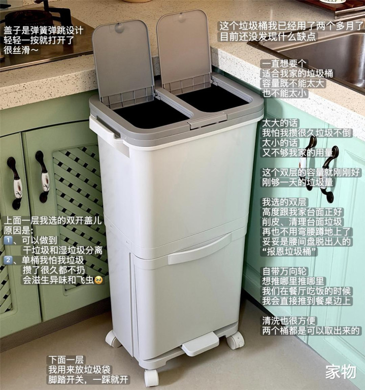 我发现了厨房最好垃圾桶,就是它,双盖分区的大号垃圾桶,它高度合适,无须弯腰就能扔垃圾,并且傍边两侧还设有干湿两个垃圾篓,可以离别将干垃圾和厨余垃圾放进去,幸免产生异味。