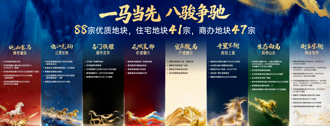 本次要点推出88宗用地,其中居住用地41宗、商服用地47宗,要点布局外洋金融城、智谷、琶洲、白云新城等要点功能区,辐照黄埔临港、番禺洛浦等宜居片区。针对地块特有属性与价值,88宗靓地分歧为“羊城八骏”八大系列——纯血良马、临江龙驹、名门骐骥、花城良骅、宜居骏马、沉宝驹、生态白马、衔玉良马,现场逐个推介。