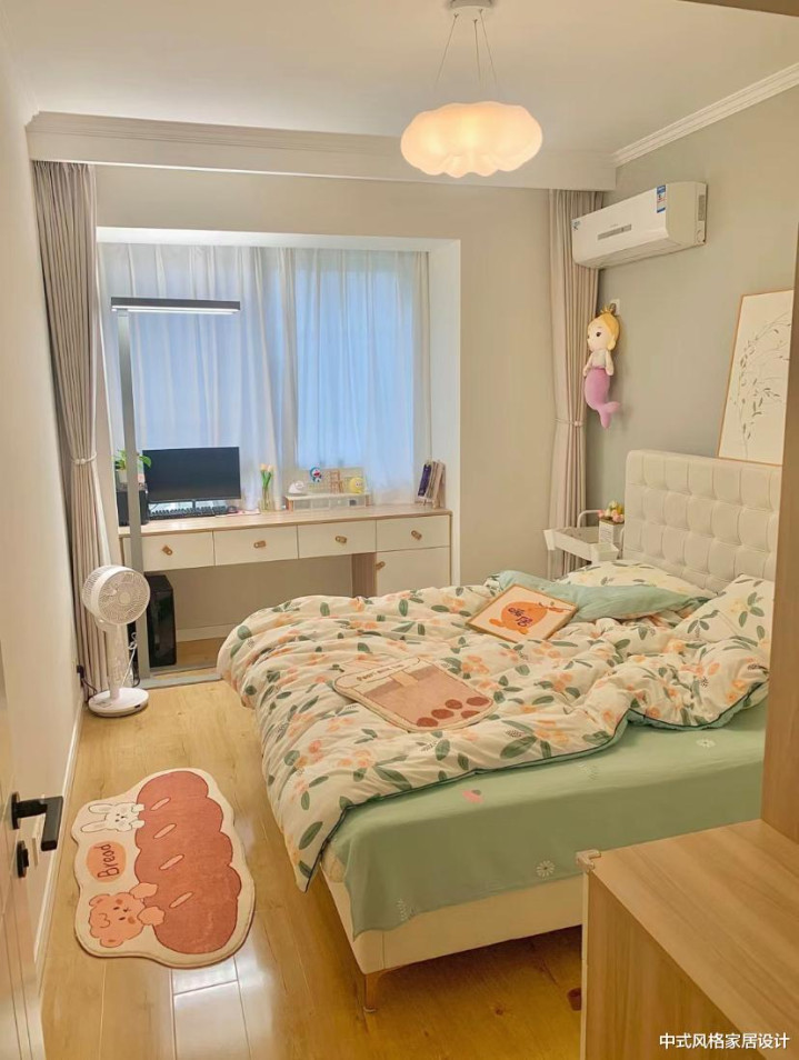 尽管房间面积有限,可是床、书桌、衣柜以及收纳设施一应俱全,实用性号称上乘。经心挑选了一张1.5×2米的大床,搭配柔滑的床头靠垫,营造出酣畅烦闷的休憩氛围。在床头墙面吊挂一幅隐敝画,为空间增添了一份艺术气味。合座交代神圣却不失温馨,让东说念主在这一方小世界中也能感受到家的善良与酣畅。