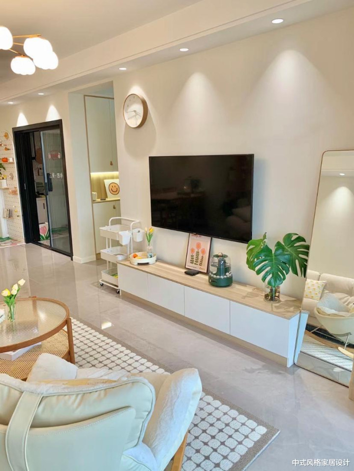 客厅开间达3.4米,并未成立繁复的布景墙。电视柜为定制项目,长2.1米,宽35厘米,高40厘米。此电视柜罗致落地策动,底部与大地紧密贴合,未留涓滴随意,从根底上幸免了卫死活角的出现。