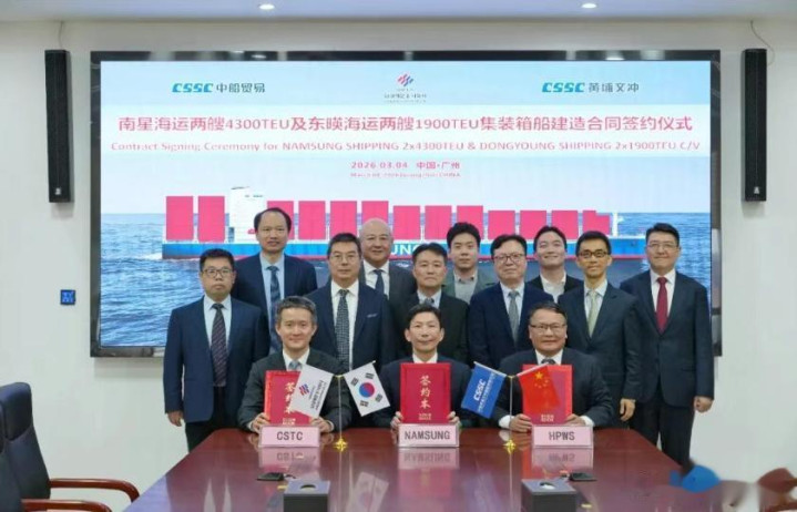 3月4日,中船集团旗下中船黄埔文冲船舶有限公司归拢中国船舶工业营业有限公司,与韩国南星海运(NAMSUNG)、东暎海运(DONGYOUNG)得胜签署2艘4300TEU和2艘1900TEU集装箱船开采左券。