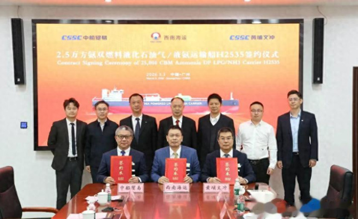 3月3日,中船黄埔文冲船舶有限公司和天津西南海运有限公司举行2.5万立方米氨双燃料液化石油气/液氨输送船(H2535)签约典礼。