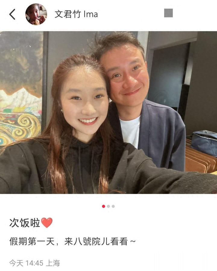 4月4日,著述与马伊琍的大儿子文君竹,乳名爱马,在叮咛平台欢快晒出与父亲著述的聚餐合照,她还写说念:次饭啦!假期第一天,来八號院儿望望~可见她休假第一天就去找爸爸吃饭,父女阵势很好。
