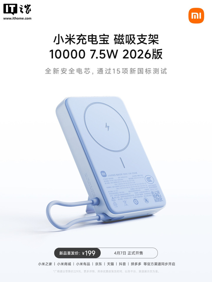 小米首款满足最新国场所充电宝当天发达发布,kaiyunsports小米充电宝磁吸支架100007.5W2026版现已开售,首发价199元。